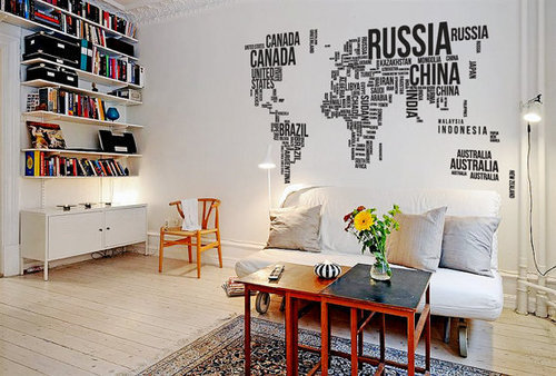 (y) Giấy dán bản đồ thế giới có thể trang trí lên mọi nơi, chỉ cần bề mặt nhẵn, không quá ghồ ghề.